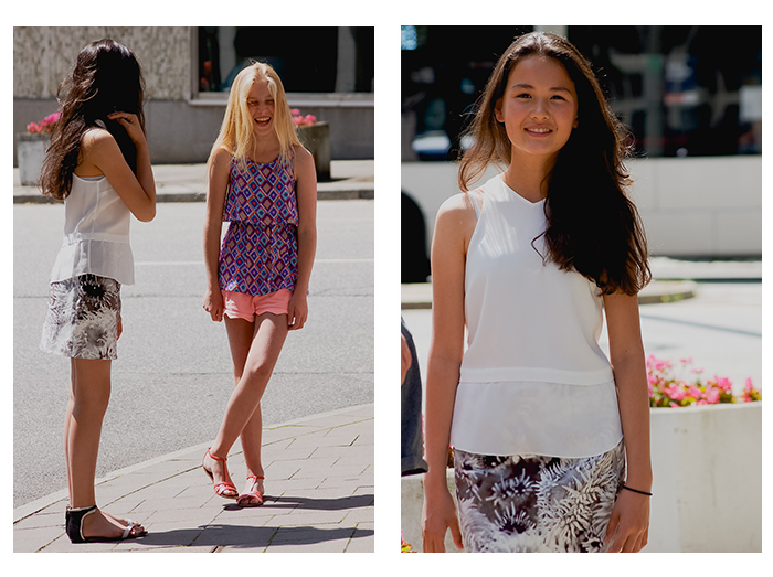 Links Yumi: 1. A.L.C. Top, Seide Gr.S 110,-€ (598292) // 2. Tibi Rock, Satin Gr.S 89,-€ (585017) // 3. Jason Wu Sandalette Gr.39 265,-€ (585017) // Rechts Jade: 1. Pepe Jeans Kleid Gr.8J 35,-€ (596591)