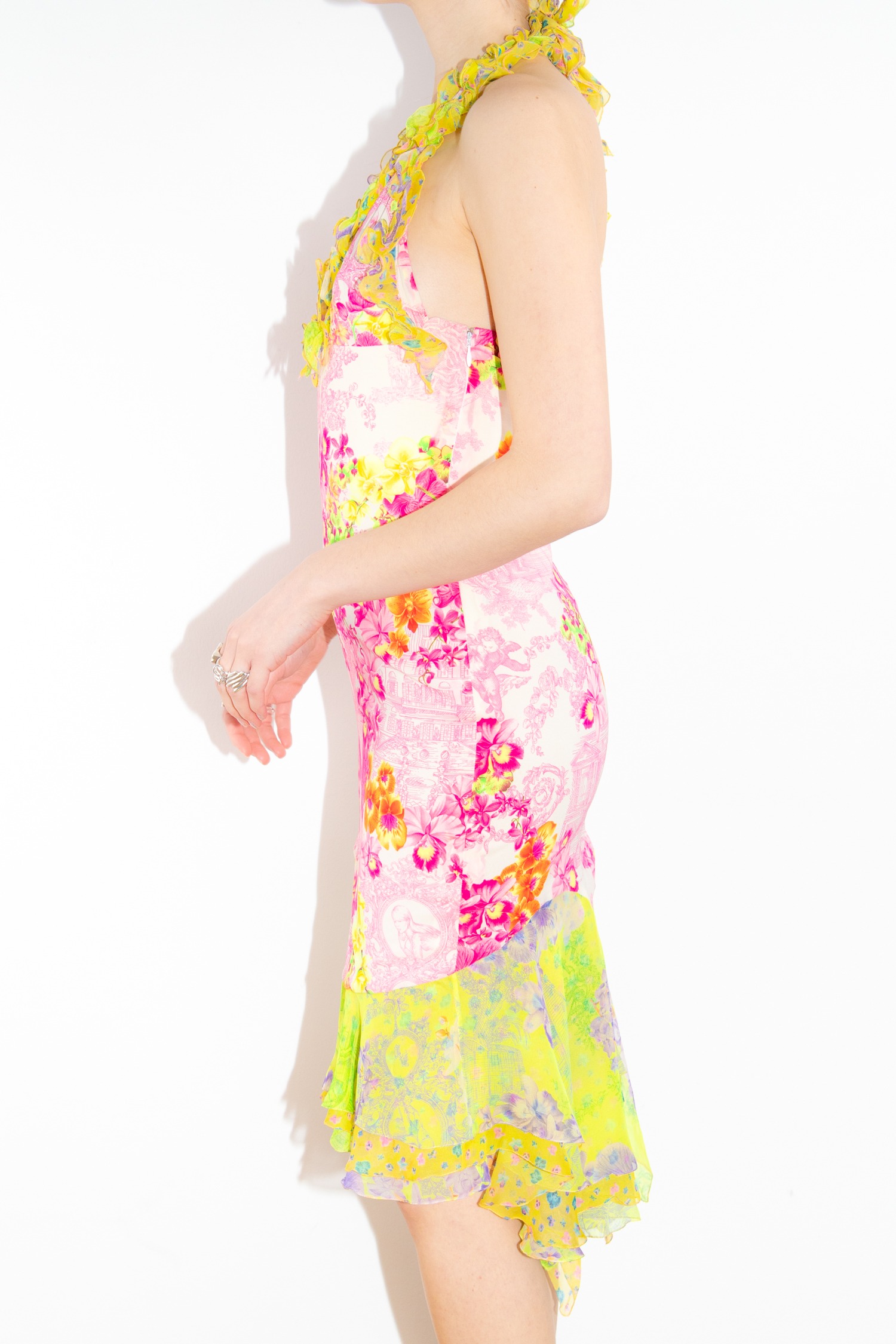 Versace florales Rüschenkleid in Grün, Gelb und Pink