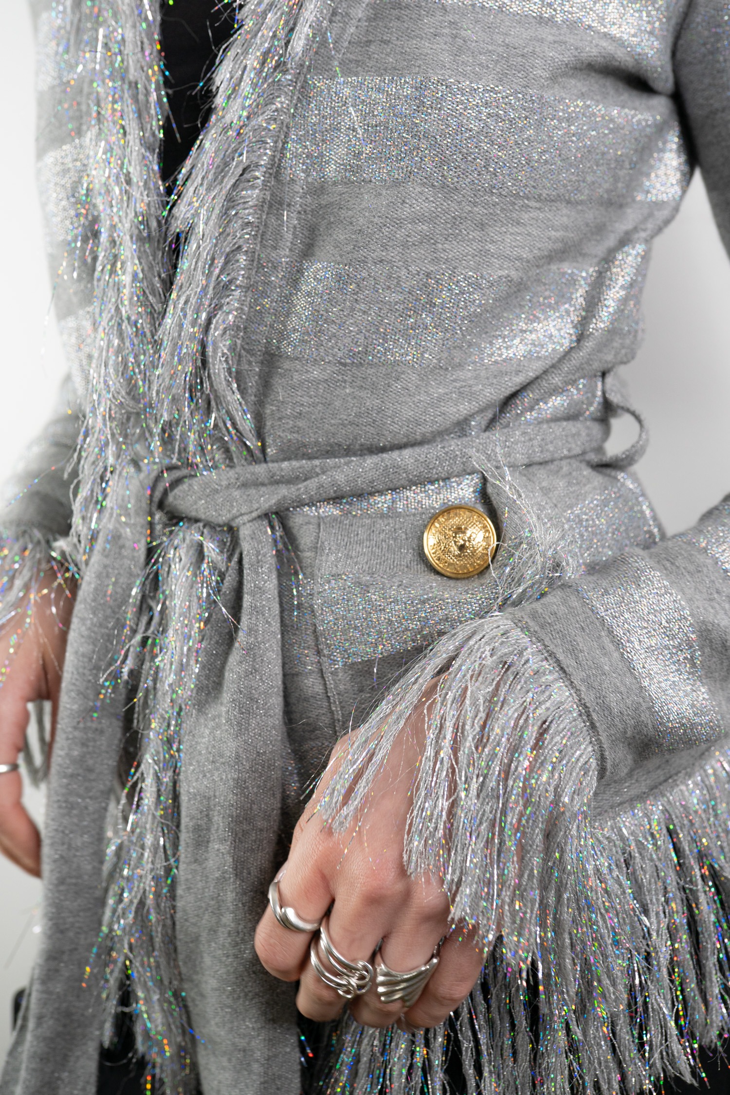 Balmain Strickjacke in Hellgrau, Silber und Gold